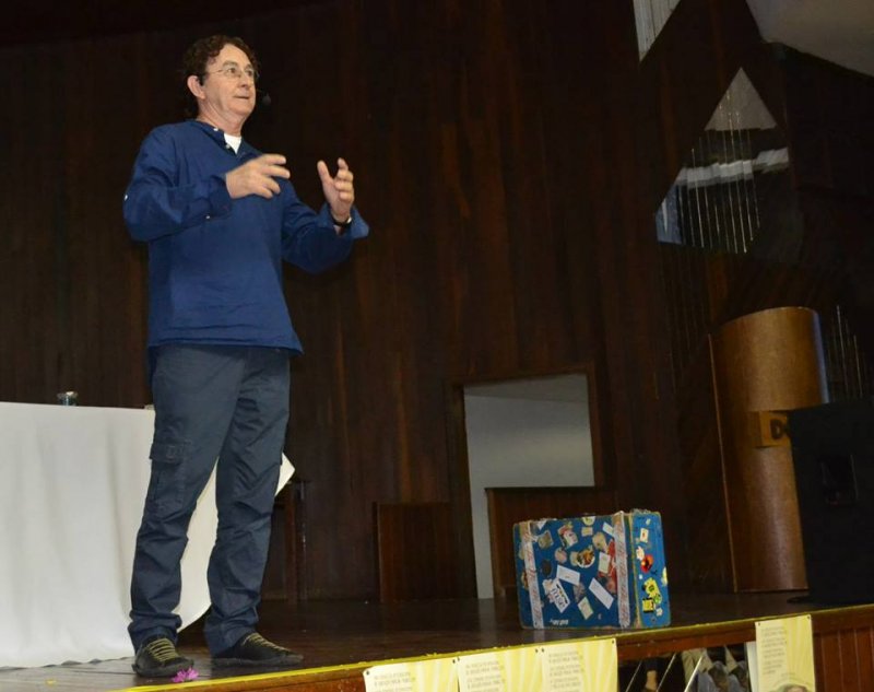 Para Rubem Alves, explicou Canellas, distribuir morangos às crianças é ensiná-las a buscar o sabor da vida, e esse é o papel do professor e de pessoas como o segundo convidado da manhã: Maurício Corrêa Leite, ou "o homem da mala azul" (foto abaixo). Acompanhe a cobertura dos eventos integrados sobre educação popular no portal do IFFar.