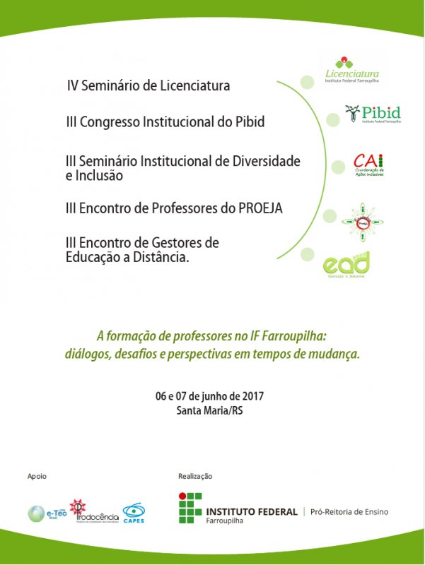 Realizado a cada dois anos, este evento integrado é voltado às pessoas envolvidas com o Pibid, Núcleos de Ensino, Pesquisa e Extensão Interdisciplinar de Formação de Professores - Prodocência, PROEJA, CAI, NEAD e alunos dos cursos de licenciatura do IF Farroupilha.