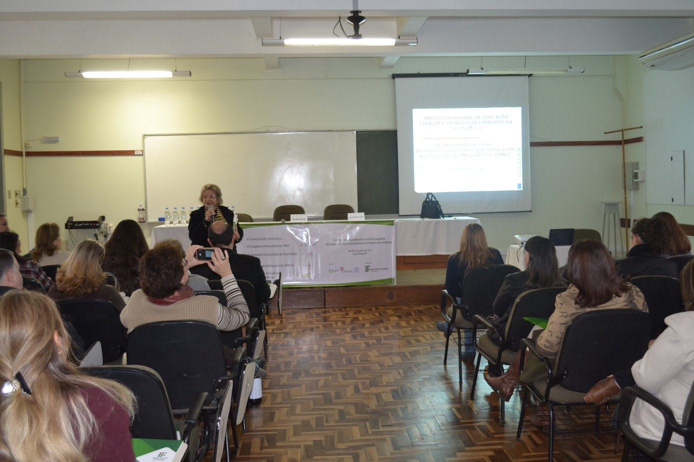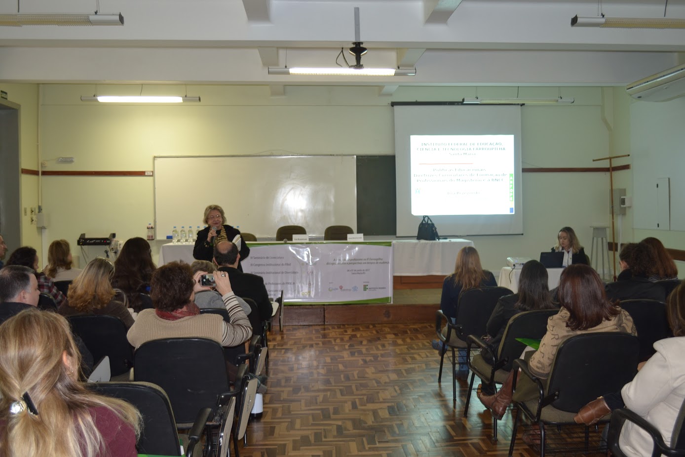 A conferência de abertura foi ministrada pela professora Íria Brzezinski (PUC Goiás) e teve como tema “Políticas Educacionais: Diretrizes Curriculares de Formação de Profissionais do Magistério e a Base Nacional Comum Curricular”. A professora Íria iniciou sua fala destacando a criação dos IFs em 2008 como um marco na formação de professores.