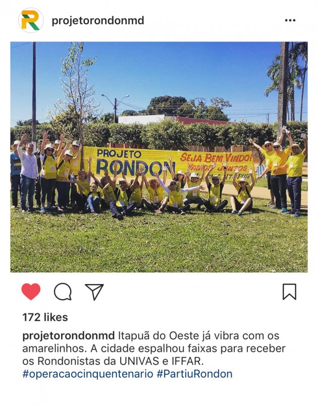 Acadêmicos e docentes do Instituto Federal Farroupilha - Campus São Vicente do Sul chegaram ao município de Itapuã do Oeste (RO) no domingo (9) para o início da Operação Cinquentenário do Projeto Rondon. Envolvendo as áreas de comunicação, meio ambiente, tecnologia e produção e trabalho, as atividades são desenvolvidas em parceria com a Universidade do Vale do Sapucaí (Univas), de Minas Gerais.