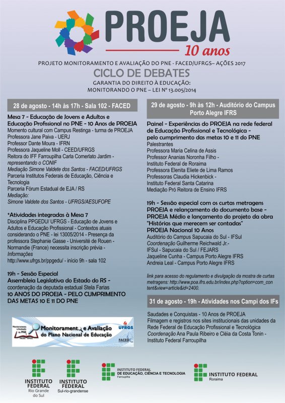 O evento é realizado pelos Institutos Federais Farroupilha (IFFar), Rio Grande do Sul (IFRS), Sul-rio-grandense (IFSul) e Roraima (IFRR), com a coordenação do Projeto Monitoramento e Avaliação do Plano Nacional de Educação (PNE) da Faculdade de Educação da Universidade Federal do Rio Grande do Sul (Faced – Ufrgs). É aberto ao público e não necessita de inscrições prévias. O evento avaliará a atuação do Proeja e o cumprimento das metas 10 e 11 do PNE, em uma programação que inclui mesa de debates, painel de palestras e uma sessão de filmes de curta metragem sobre o Programa.