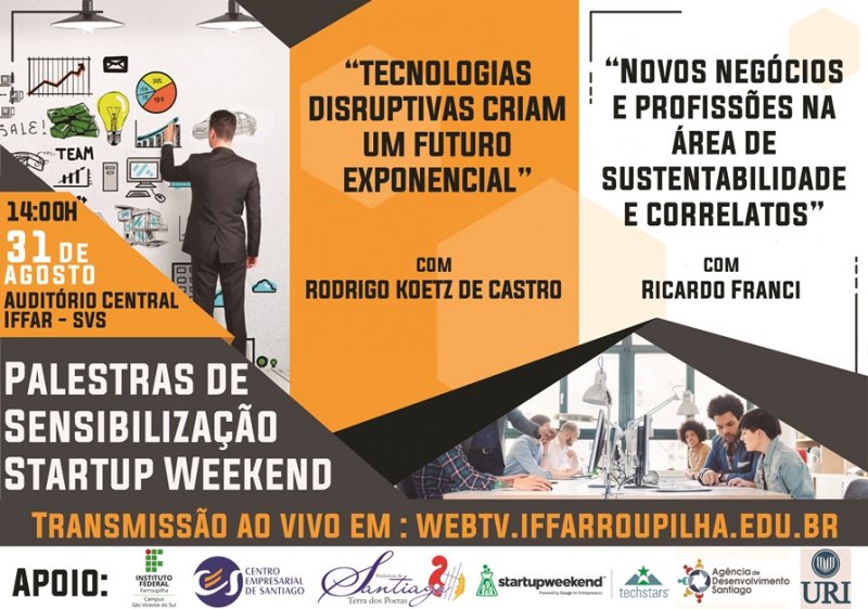 Este é o segundo ano em que o IFFar, através do Núcleo de Inovação e Transferência Tecnológica, entra como apoiador do Startup Weekend de Santiago. Como forma de preparação para os participantes do evento são proporcionadas algumas palestras como estas que ocorrerão no dia 31. Como os temas ligados a empreendedorismo e inovação são atuais e importantes para diversas áreas do conhecimento, todos os alunos do IFFar são convidades a assistir as palestras, presencialmente, ou pela WebTV.
