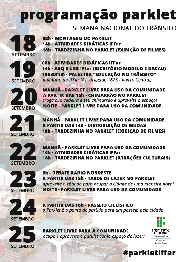 O parklet será instalado nesta segunda-feira (18), no município de Santa Rosa, na esquina das Avenidas Rio Branco e América. O projeto será liderado pela equipe do Escritório Modelo do curso de Arquitetura e Urbanismo do Instituto Federal Farroupilha. Serão realizadas diversas atividades no local durante toda a Semana Nacional do Trânsito, como exibição de filmes, debates e atividades didáticas. A programação completa está disponível nos anexos desta notícia.
