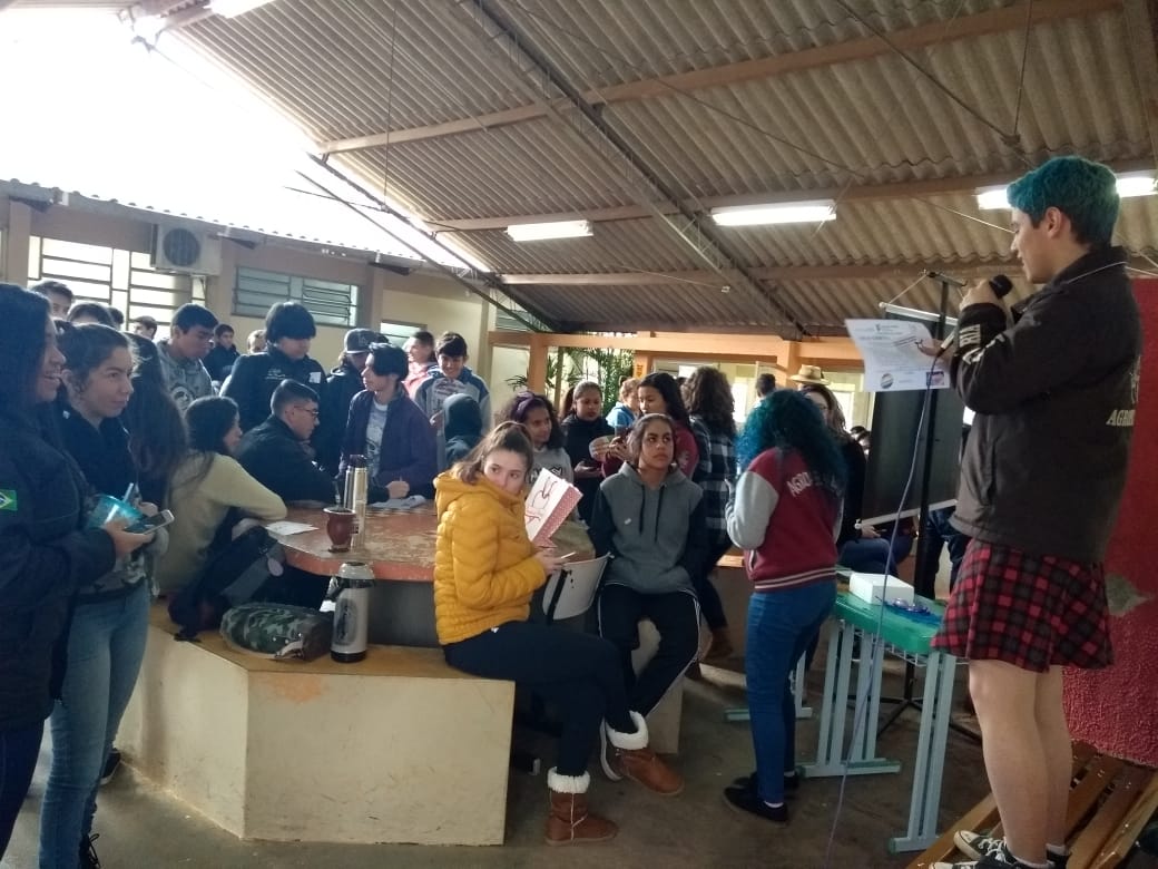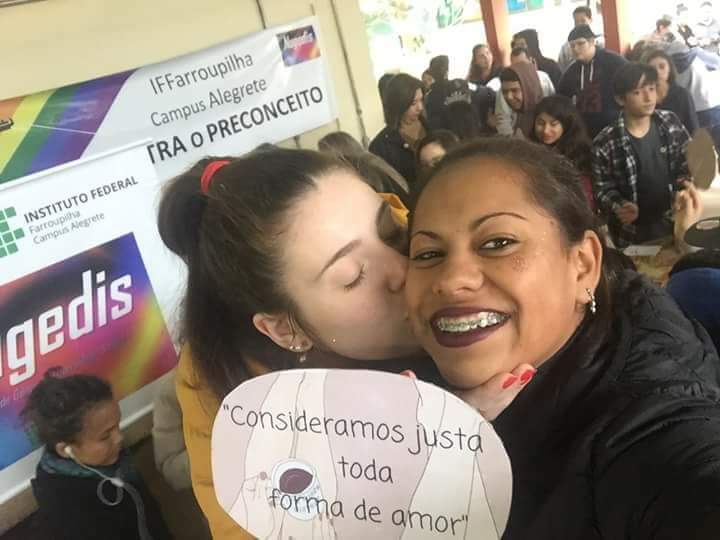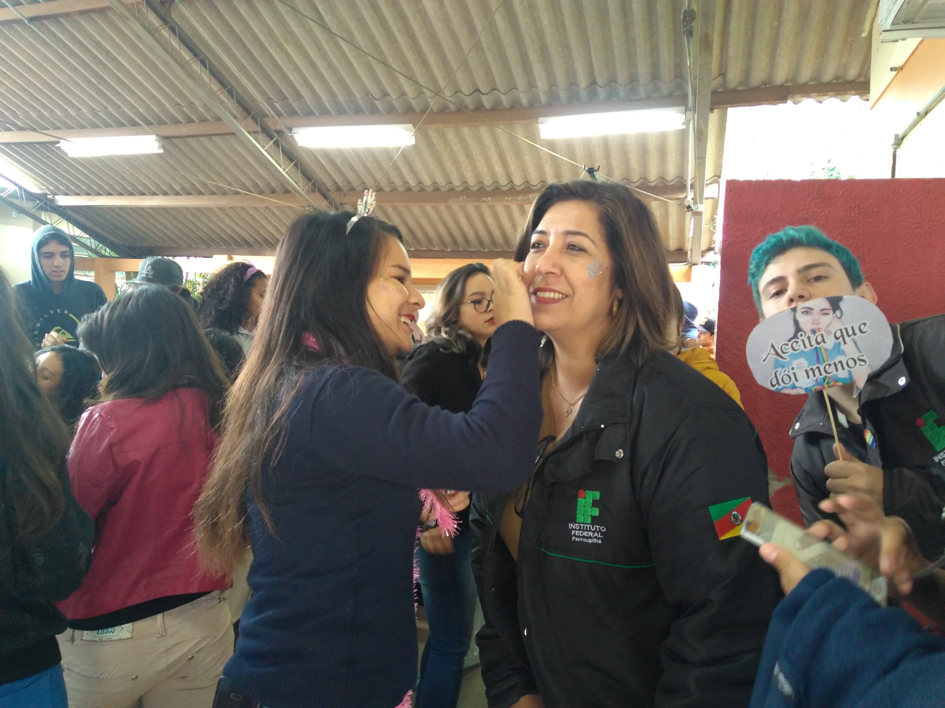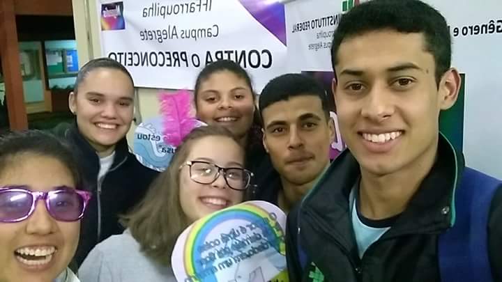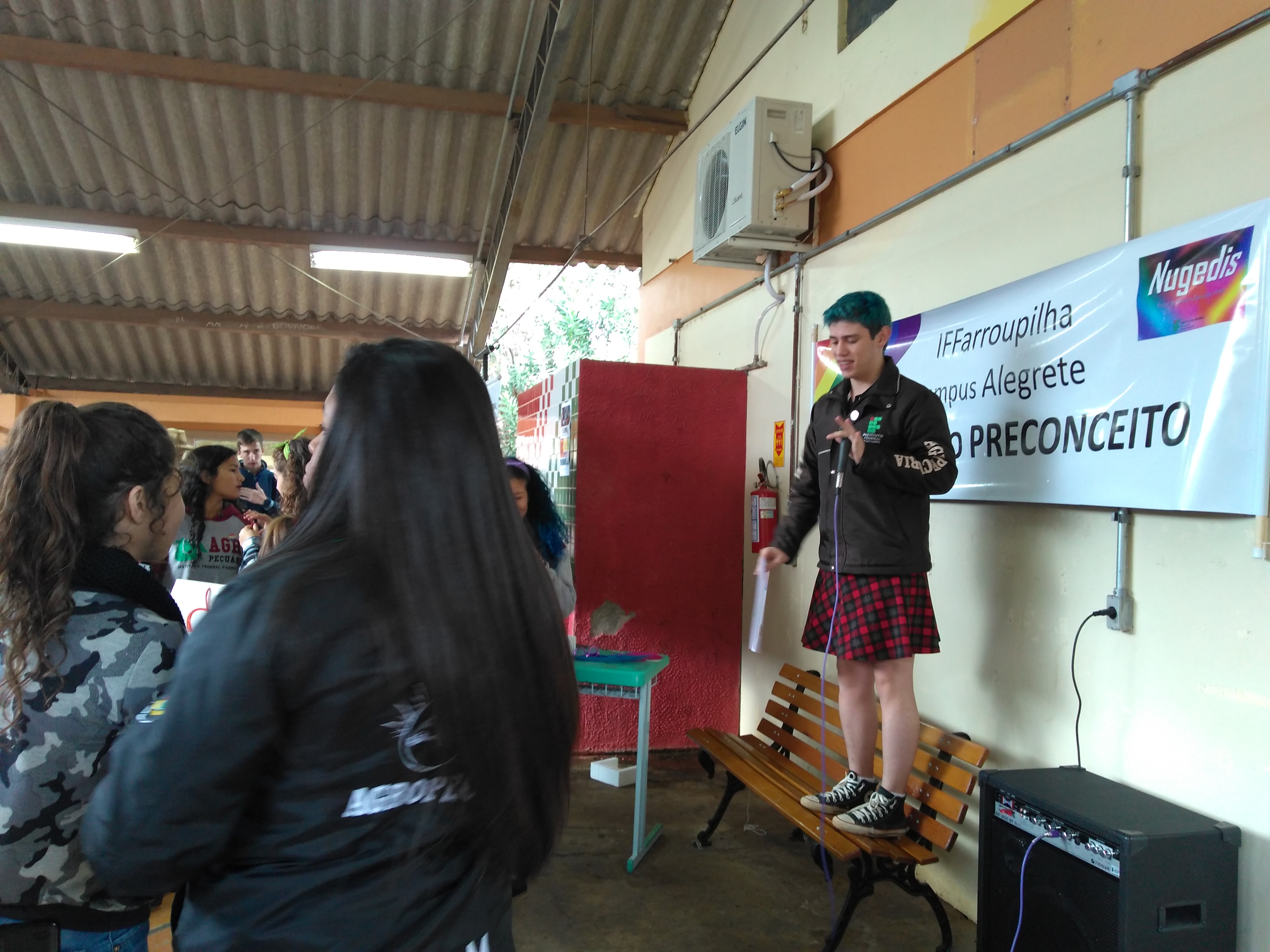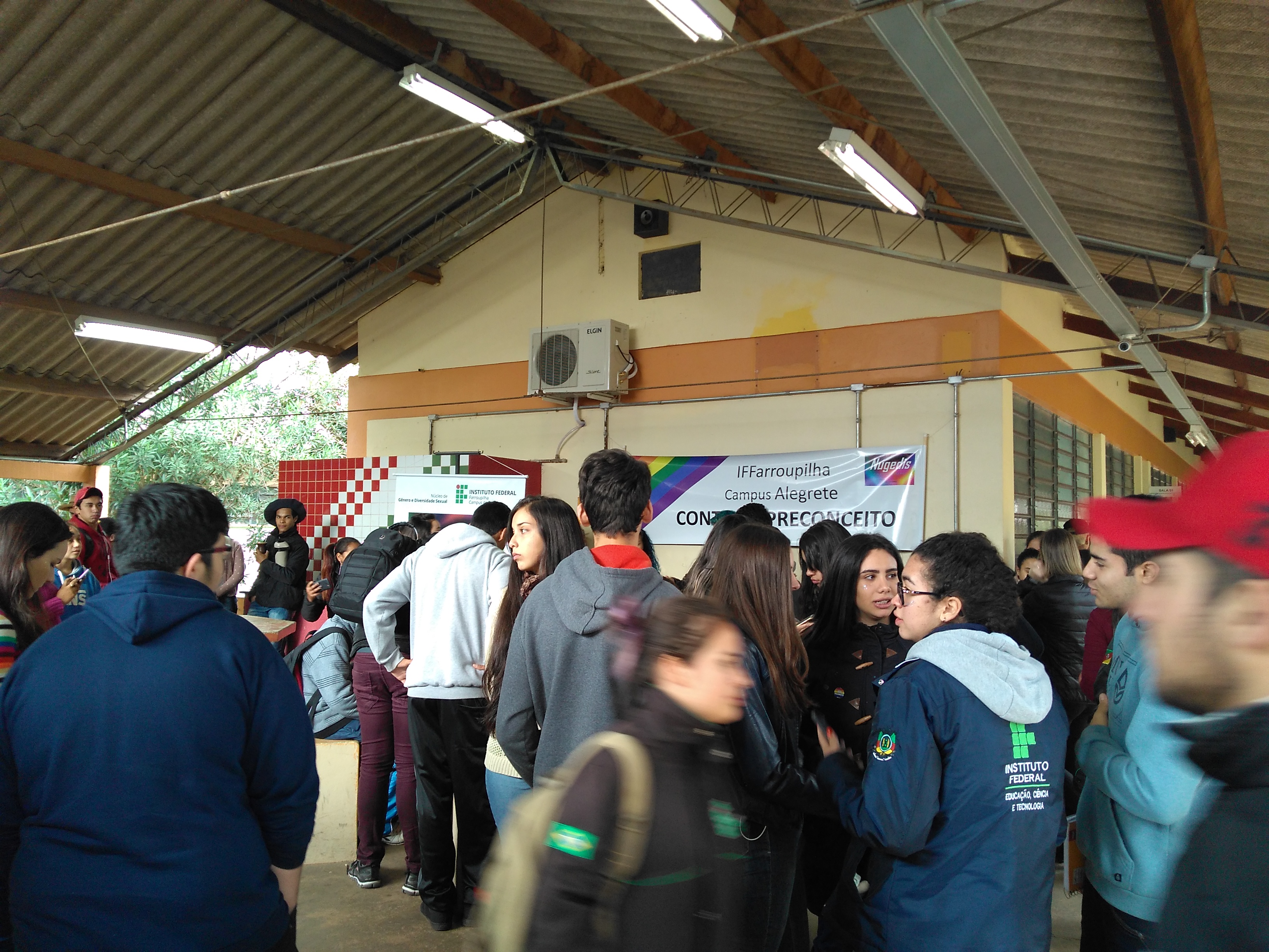 A programação do IFFar - Campus Alegrete começou pela manhã, na área de convivência. Os alunos e alunas dos cursos técnicos integrados participaram do "Stand da diversidade". O momento foi de integração e diálogo sobre a importância da data, com música e muita selfie contra o preconceito.