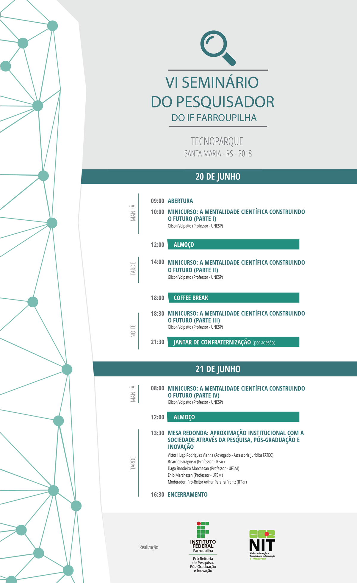 Nos dias 20 e 21 de junho, o IFFar irá promover o VI Seminário do Pesquisador no Santa Maria Tecnoparque. As inscrições estão abertas até o dia 11 de junho.